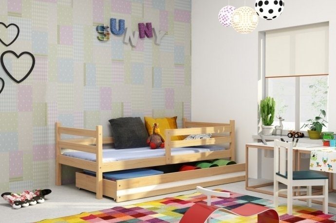 En barnsäng i klassisk stil med avtagbara räcken när barnet känner sig säker nog utan. Sängen har en praktisk låda undertill som exempelvis kan användas för förvaring av leksaker och annat som används mycket.