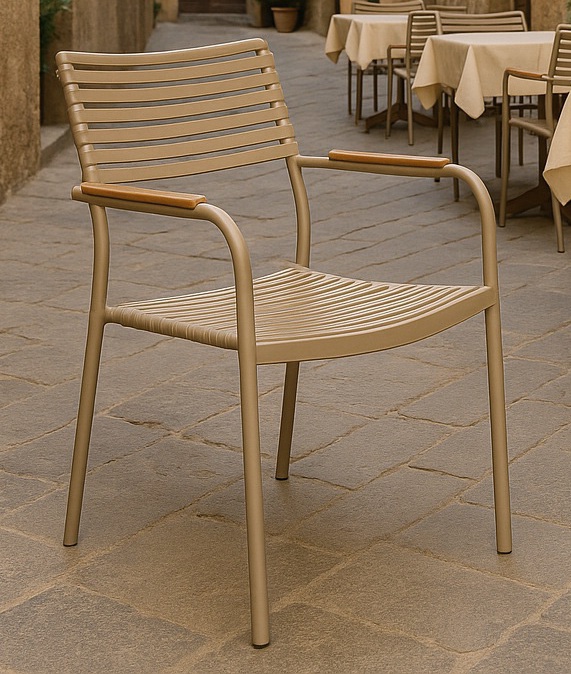 Stolarna har en lätt och smidig design i beige lackad metall med sits och ryggstöd i slitstark plast. Handtagen har en dekorativ detalj i aintwood som bryter av och skapar en mjukare helhet. Stolarna är stapelbara, vilket gör dem enkla att ställa undan när de inte används.